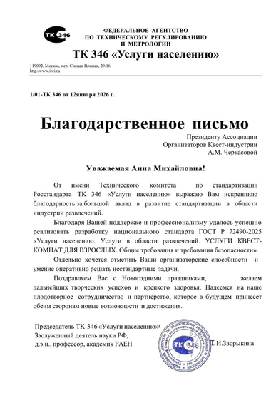 Сегодня к нам пришло официальное «спасибо» из Росстандарта. Полгода наш генеральный директор и президент Ассоциации (АОКИ) Анна Черкасова вместе с коллегами из отрасли участвовала в разработке государственного стандарта (ГОСТ) для квестов.